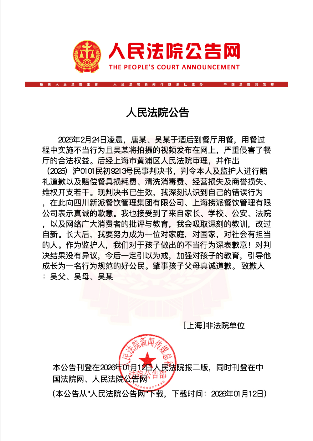 1月8日,并激发普遍关心。2025年2月24日凌晨,事务发生后,。通知布告网已公开“海底捞小便”事务当事人唐某及其父母的报歉声明。坐上餐桌往沸腾的暖锅里小便。后经上海市黄浦区审理,此前,严沉侵害了餐厅的权益。其老友吴某将此过程拍摄下来并发布至微信伴侣圈,